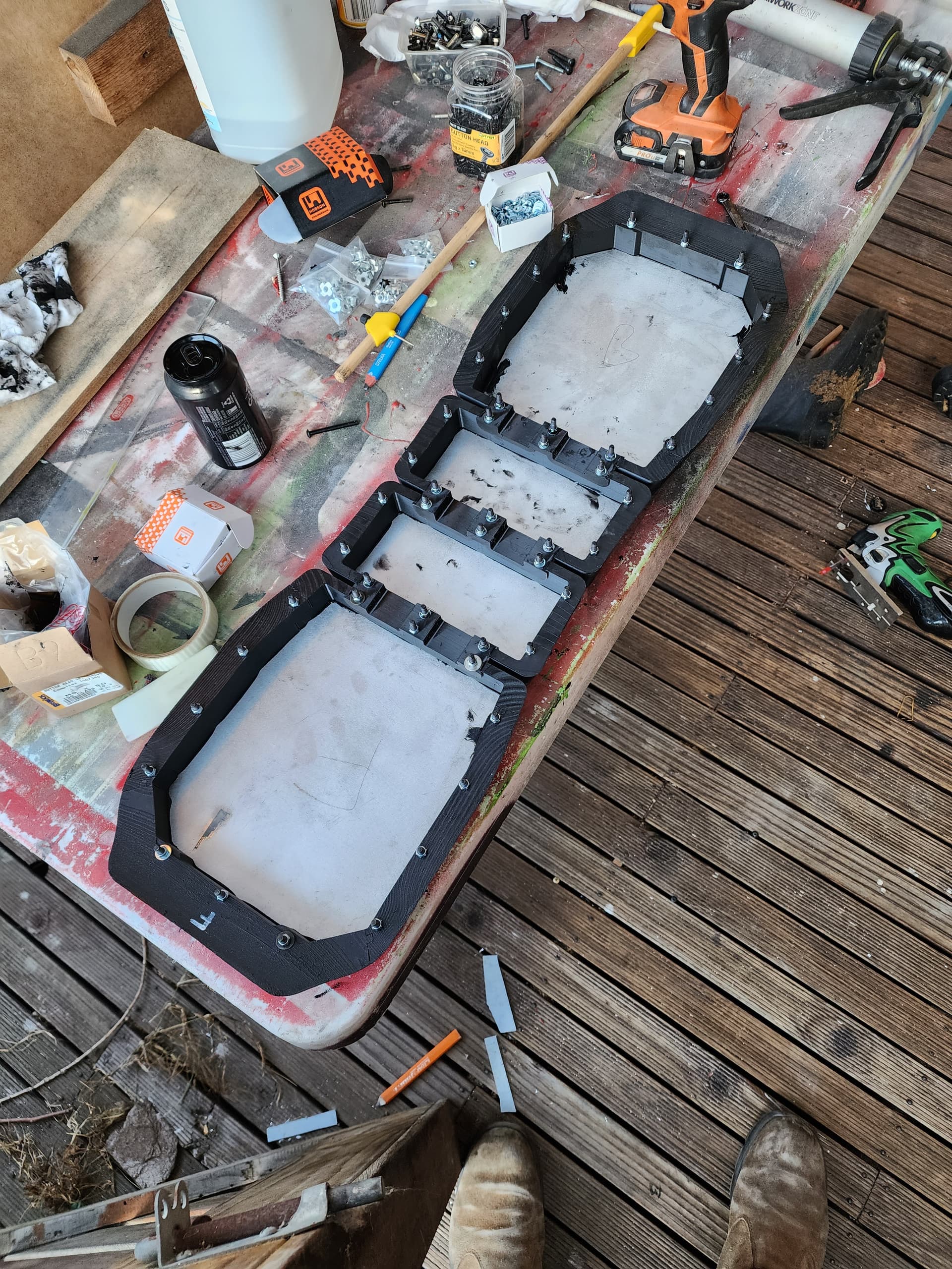 Found a tiny bit of time. Slapped on the Contino Condoms and got messy with the sikaflex. Sealed between all the aluminium/petg/tpu sections, as well as sealing in the joins where the petg walls connect together for the larger sections.
