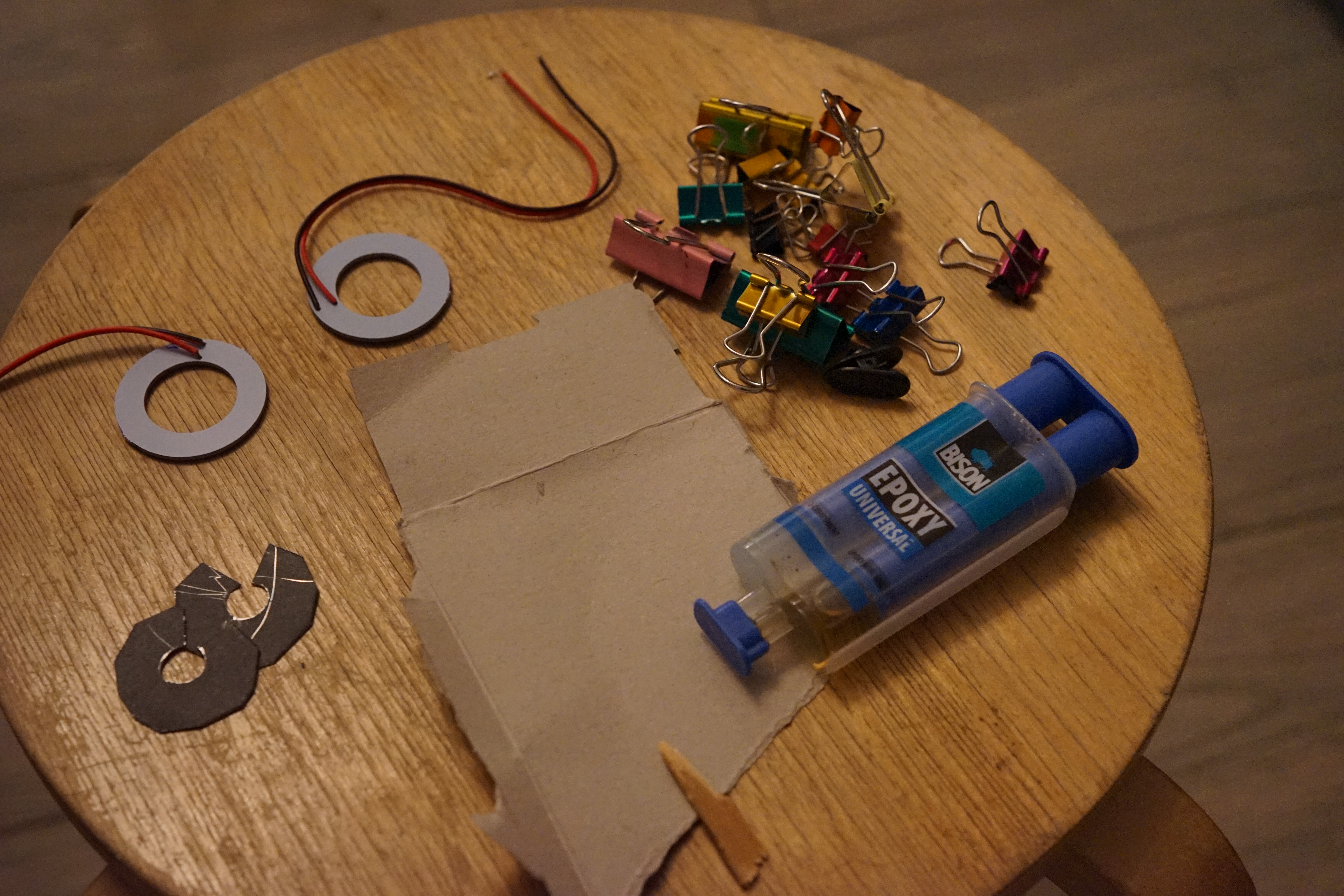 Mix up your epoxy equal parts or whatever’s written on the tube, apply it to the bottom of the ring lights, and then put your cut metal pieces on.
