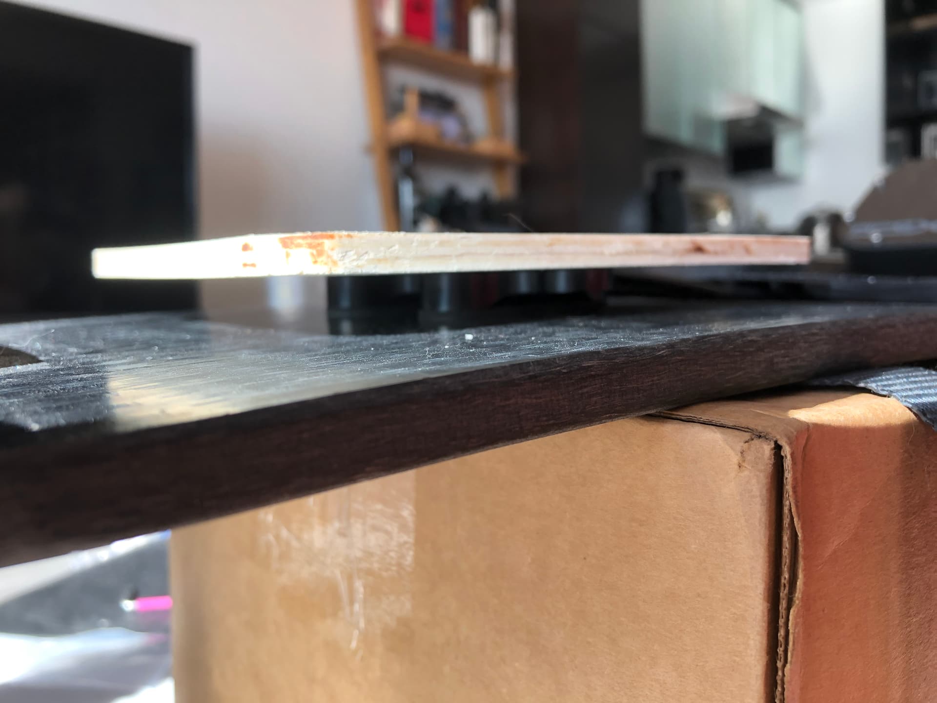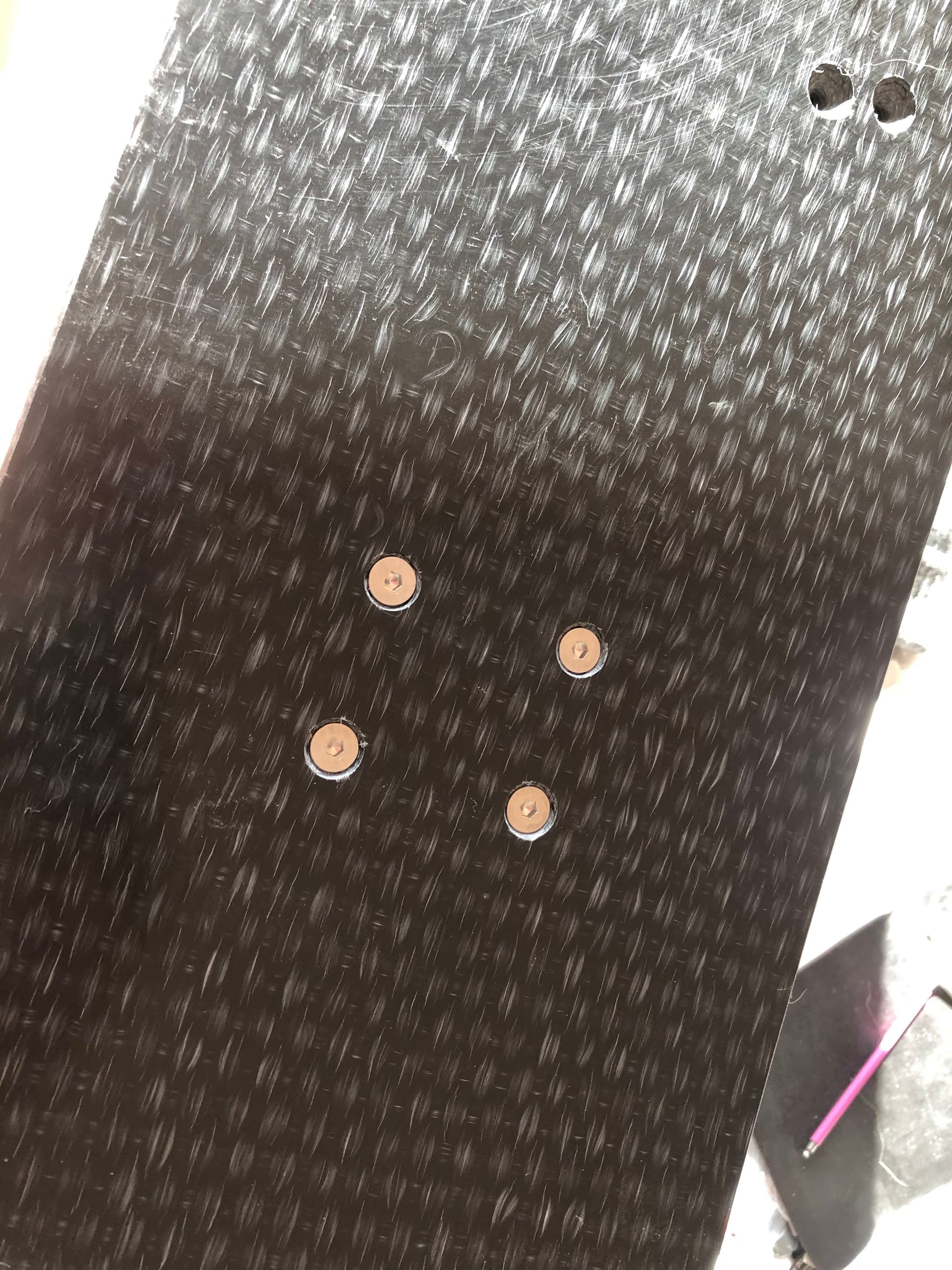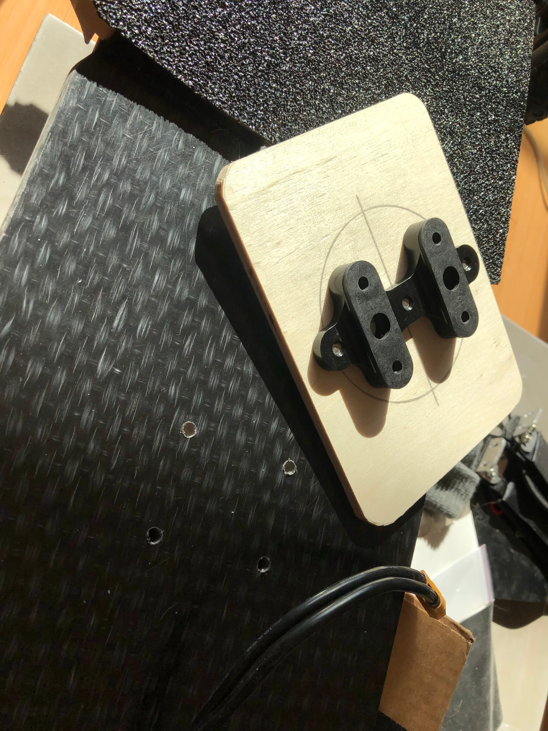Piece of wood with dual lock mounted on trampa dog bone mounted on deck. There is rubber between dog bone and deck for additional flex x damper.