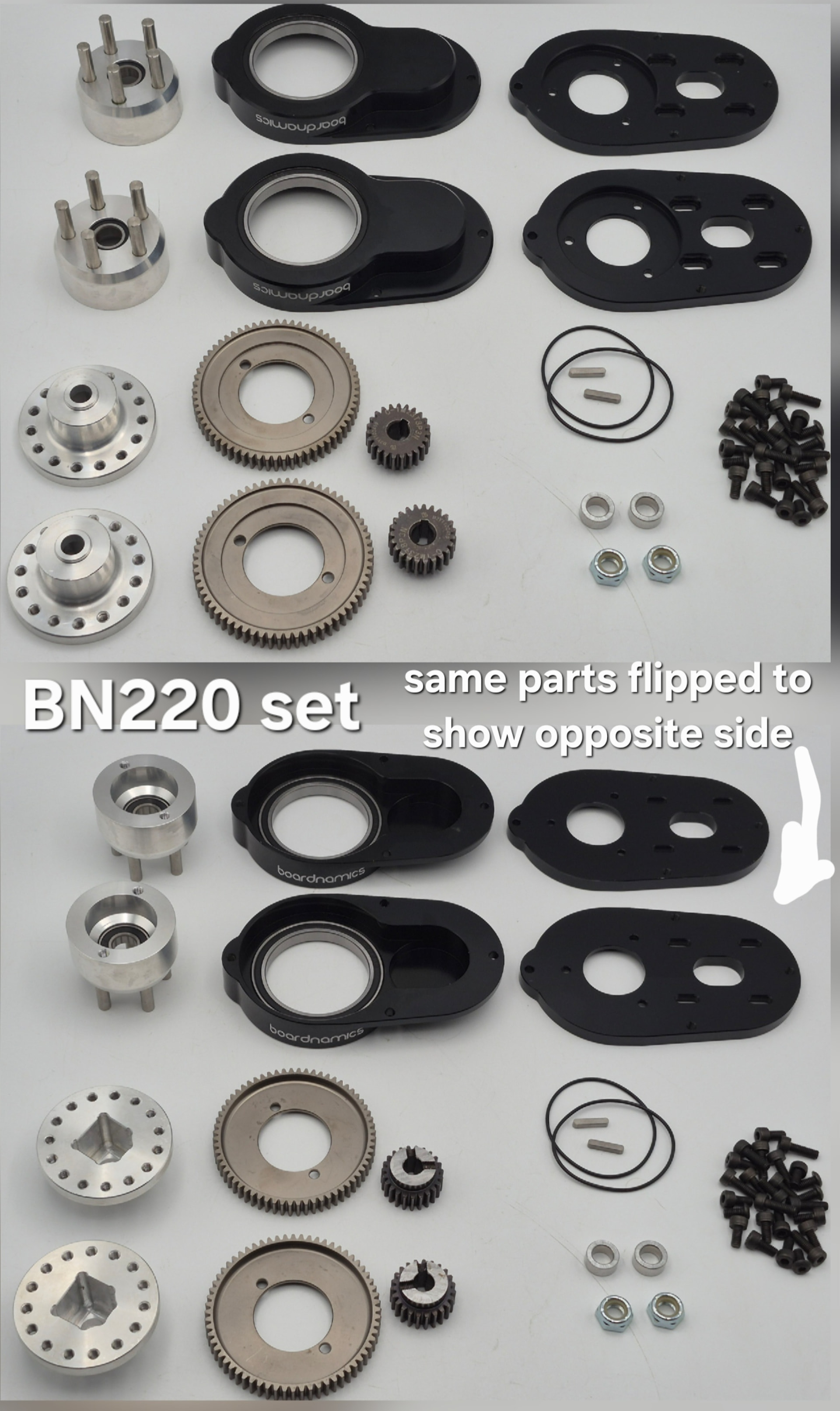 Description: 2 pcs motor plate, 2 pcs gearbox cover, 2 pcs straight cut gear set, 2 pcs BN220 truck adapters (for 8mm axle), 2 pcs kegel wheel adapter, and hardware kit.