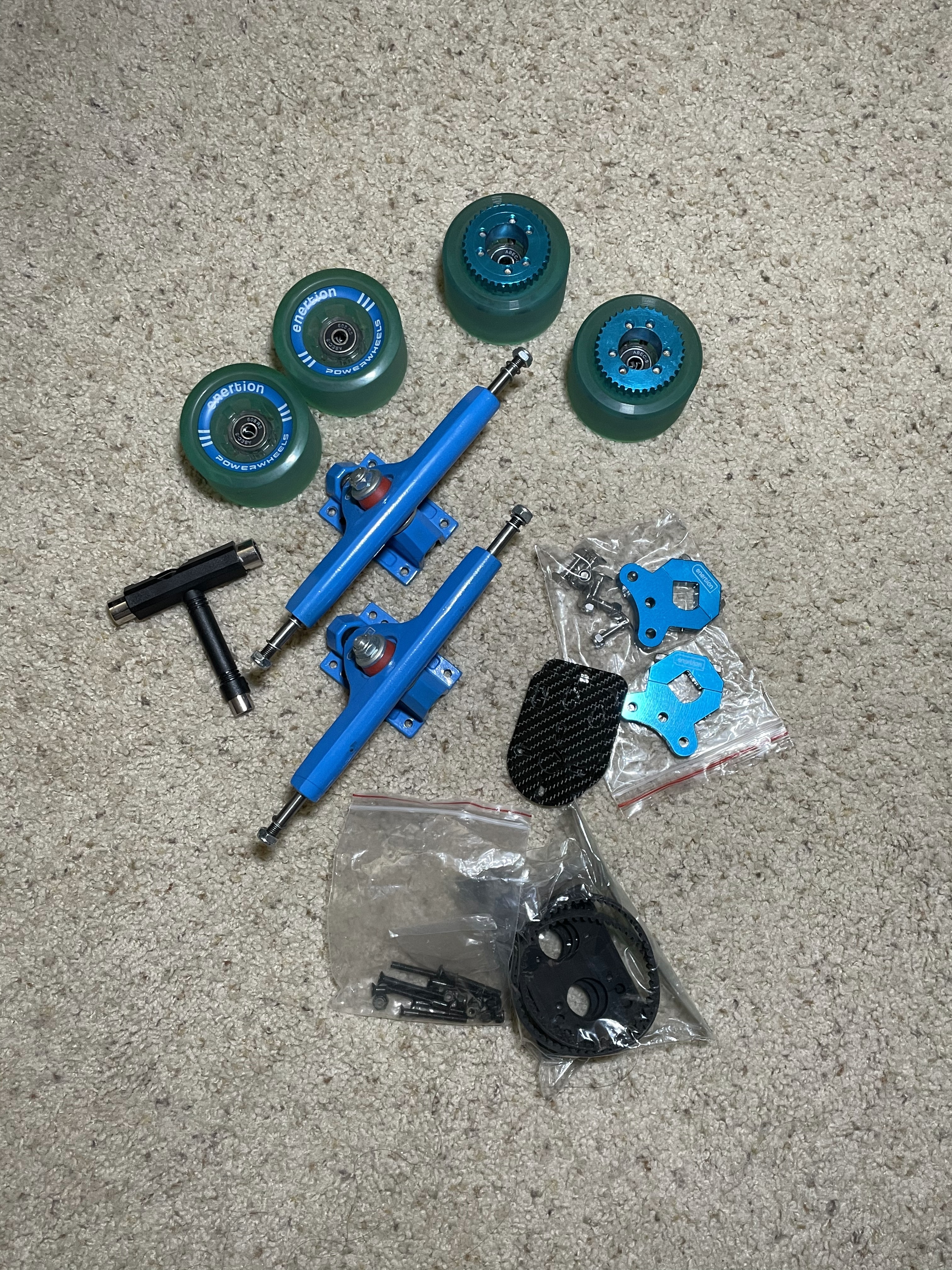 Description: Basically brand new. Comes with wheels, trucks (Caliber), Enertion motor mounts, hardware, and pulleys.