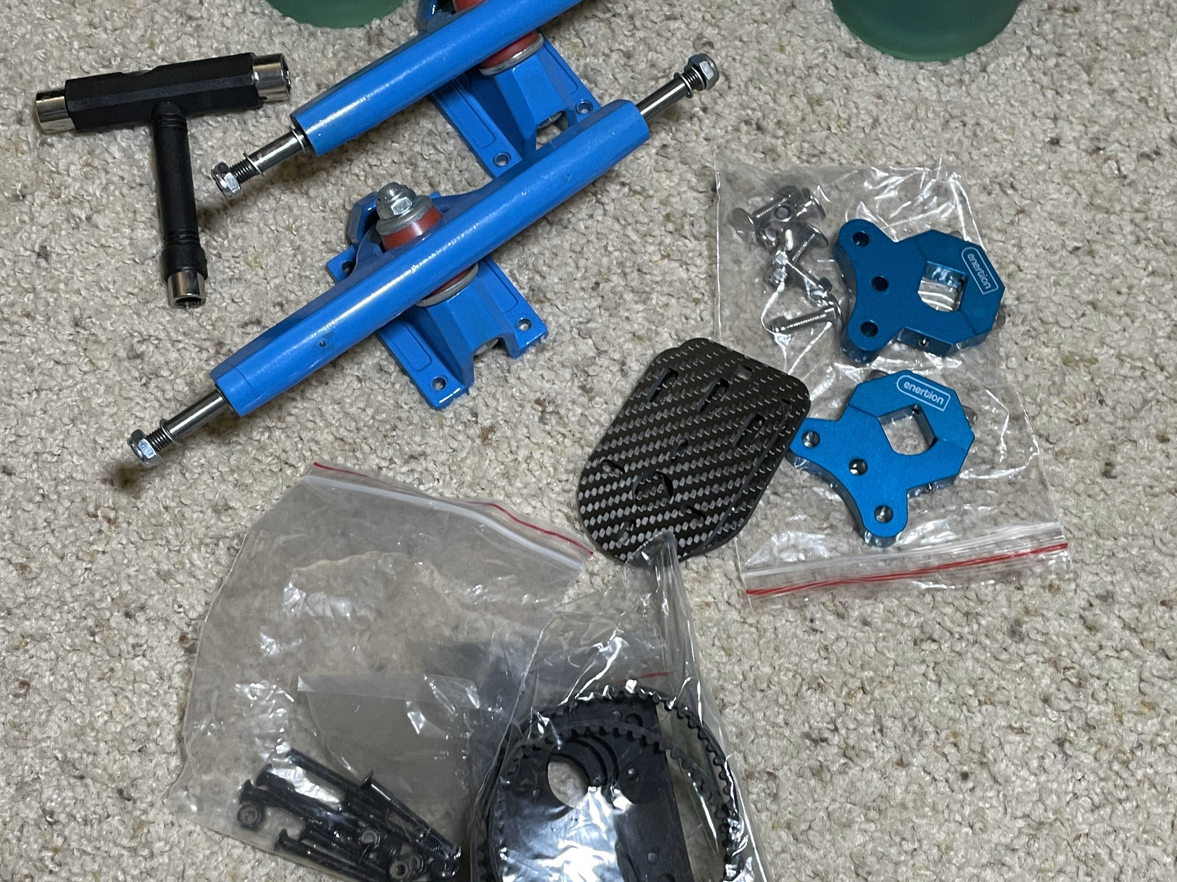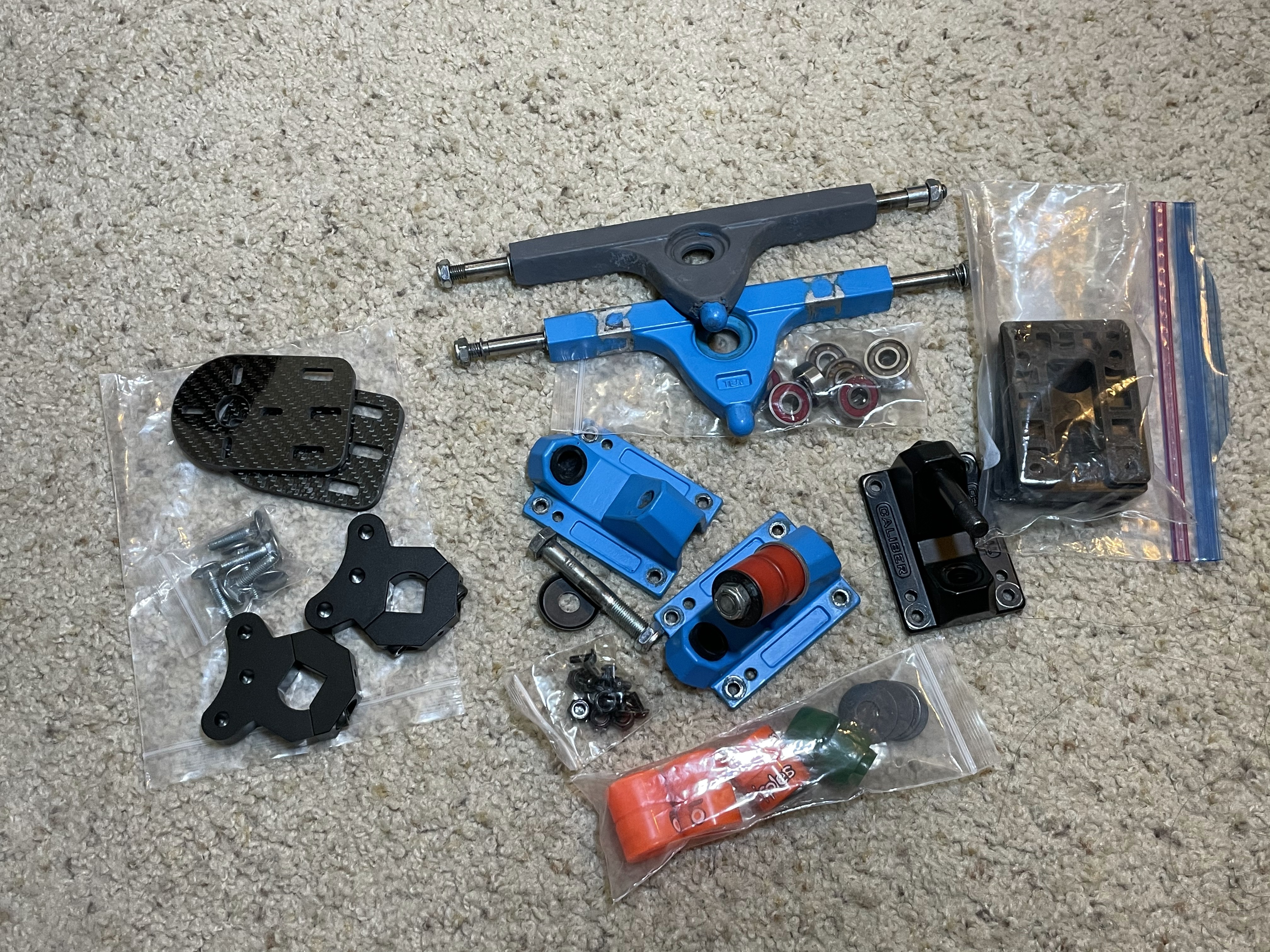 Description: Trucks, Enertion-style motor mount (from Miami Eboards) and other stuff.