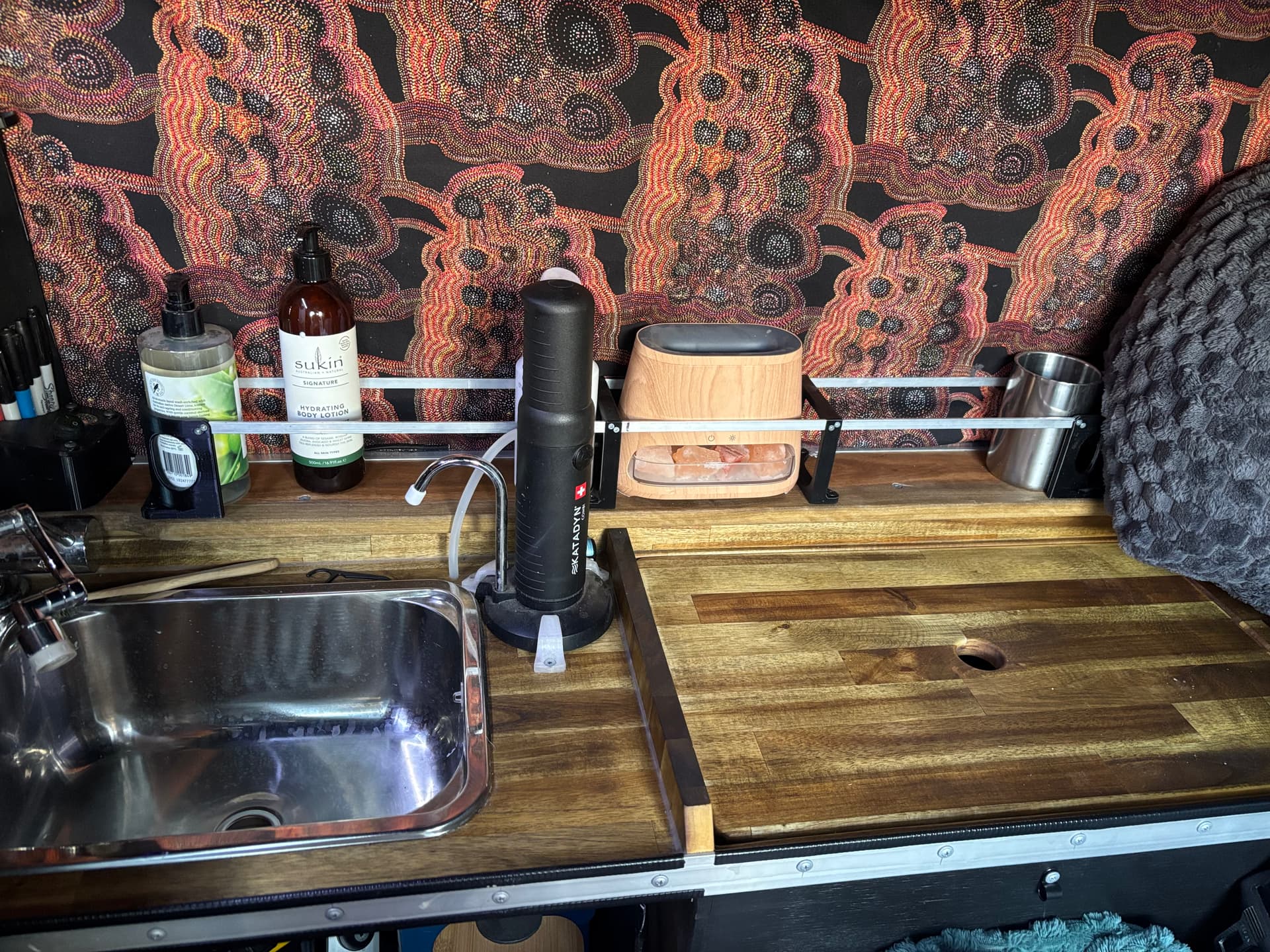 The plan all along has been to install stretch carpet over all of the insulated panels. I’ve been dreading it, as it requires cutting everything neatly to shape and applying spray adhesive to both the carpet and the panels.