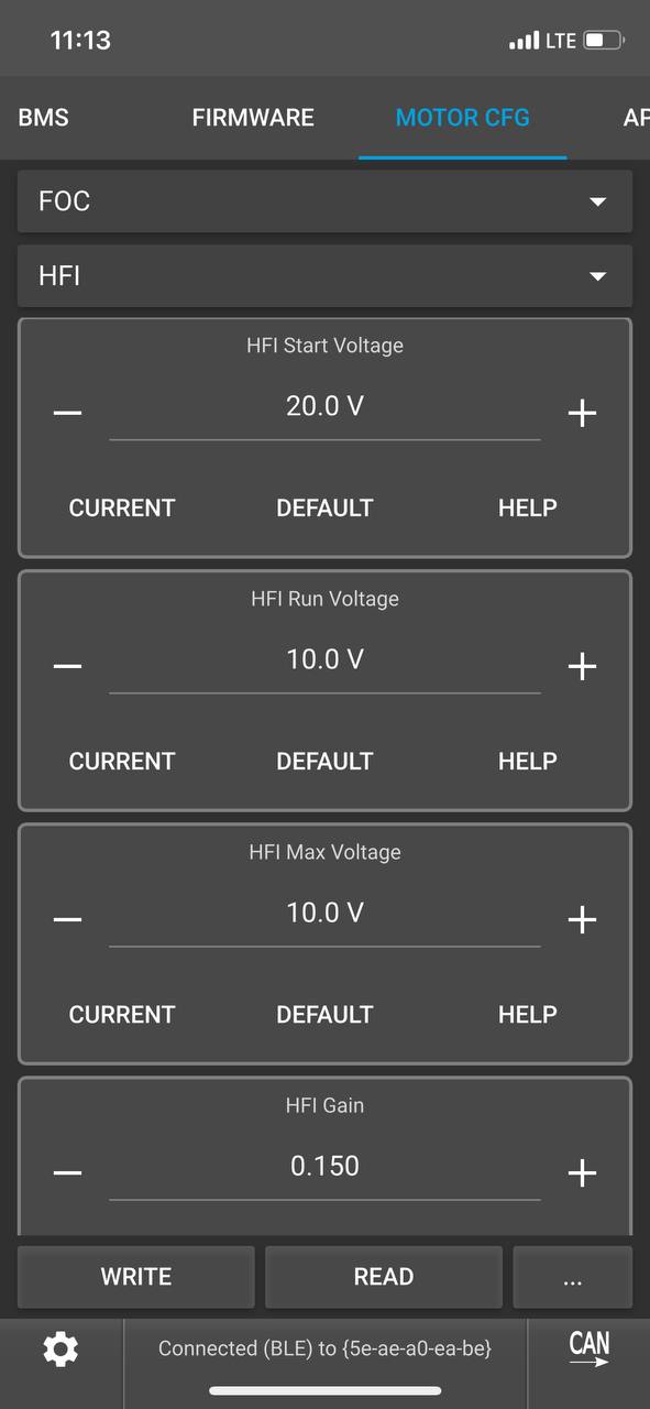 second issue with this mode: smart reverse does not work at all: jerks around like sensorless mode. if anyone knows some settings how to fix this, would be highly appreciated, I use smart reverse a lot when breaking on a decline, and backing up the board if I overshoot the desired spot to come to full stop. but then again I wish I could go back to sensored mode, my sensor cables are flawless, the motors are less than a week old, and I (and support) can’t get vesctool to detect those pesky sensors. (cabling is flawless) I will let you know more about hfi mode as for now I will ride 45hfi silent exclusively.