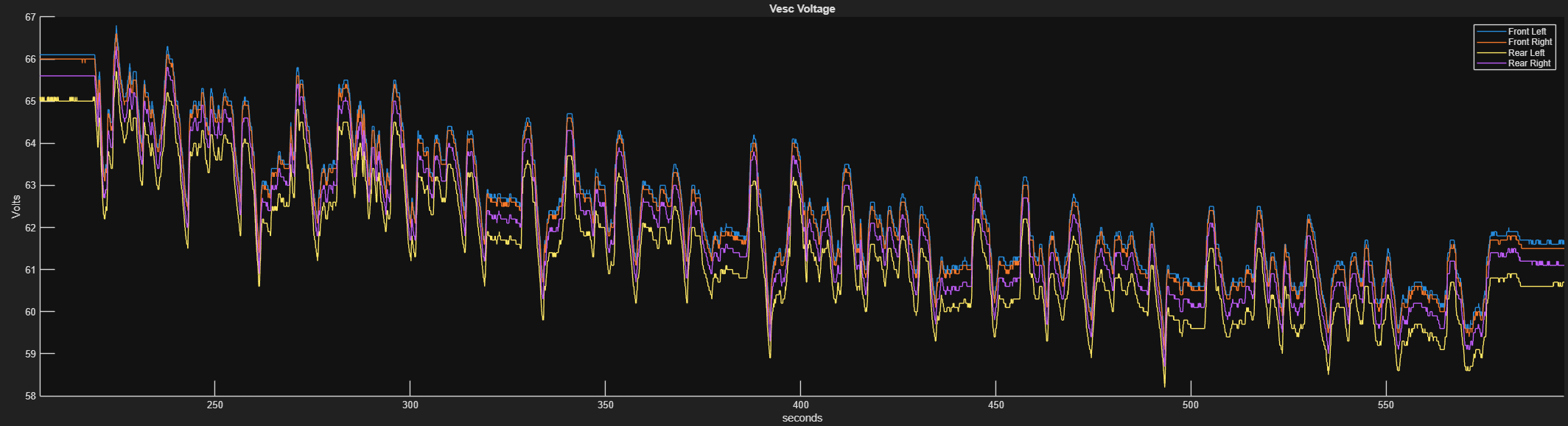 Here’s a chart of the voltage from a couple minutes of racing.