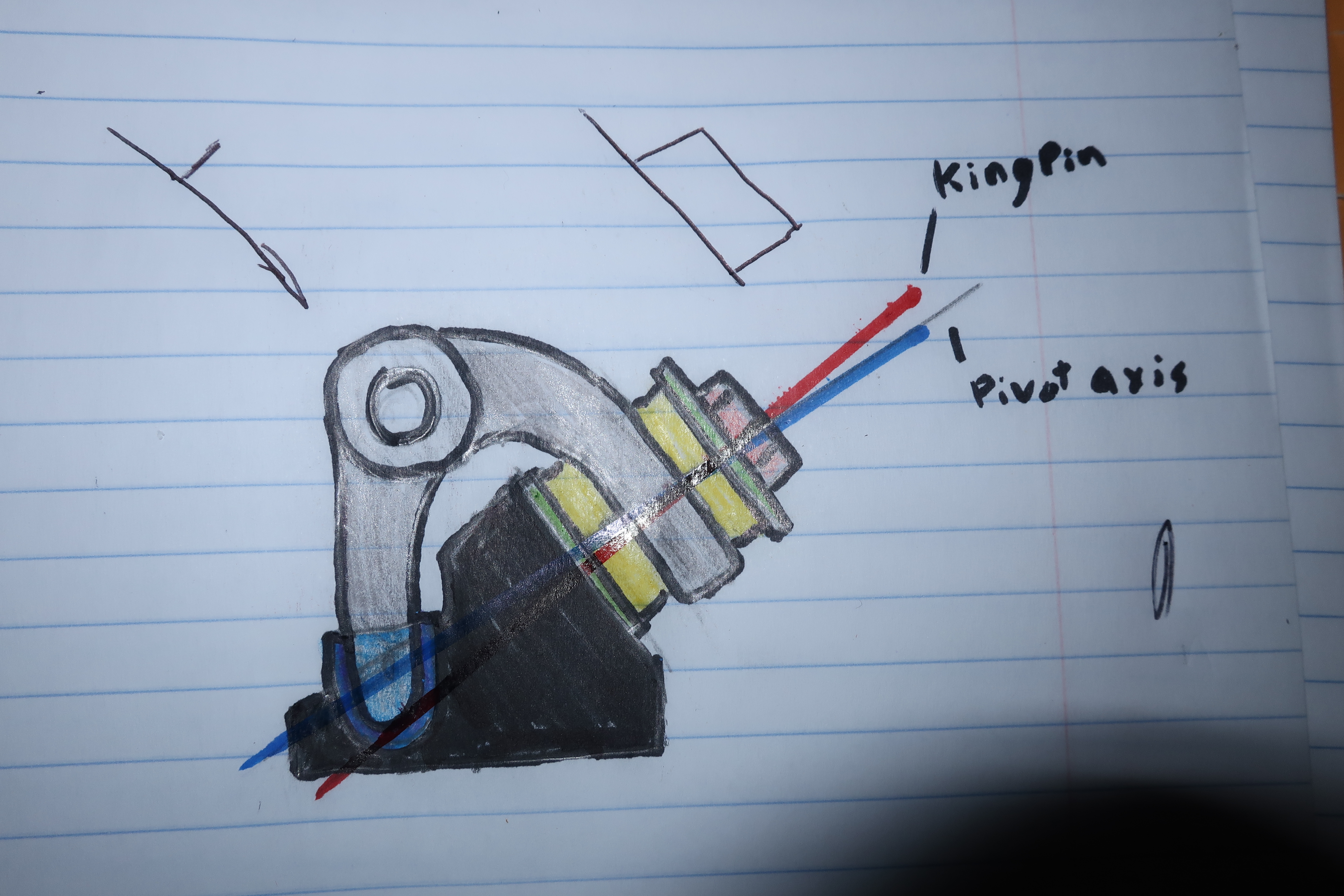 So here Iāve got this really crazy truck where the king pin and pivot axis are nearly in line, however still in the same order as with a normal TKP, with the king pin being more vertical than the pivot axis.