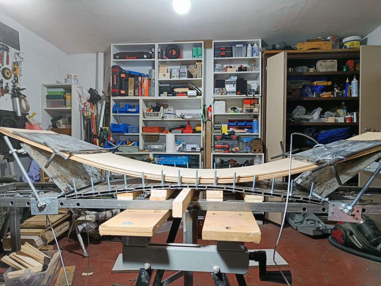 I got my brother-in-law into eskates and we have been building crazy stuff since then. His latest idea is a fully customizable modular mountainboard mould, that can be configured with tip angles from 10 to 50 degrees, length from 70 to 100cm and variable camber from 10 to 90 (!!!) mm. We tested it yesterday with a pretty radical config: