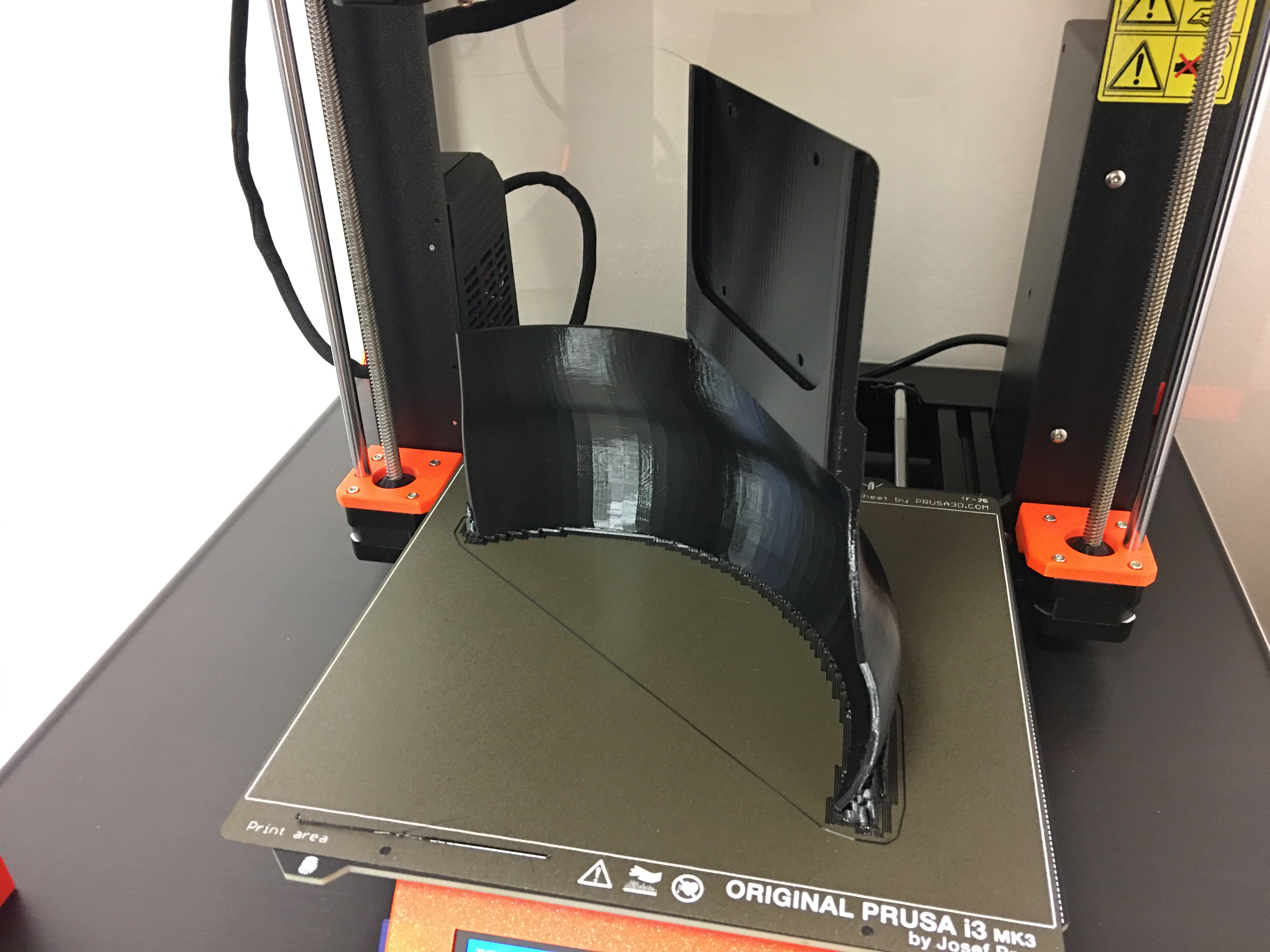 I printed the first part today with some supports near the bottom to prevent it from flipping over. It came out pretty well.