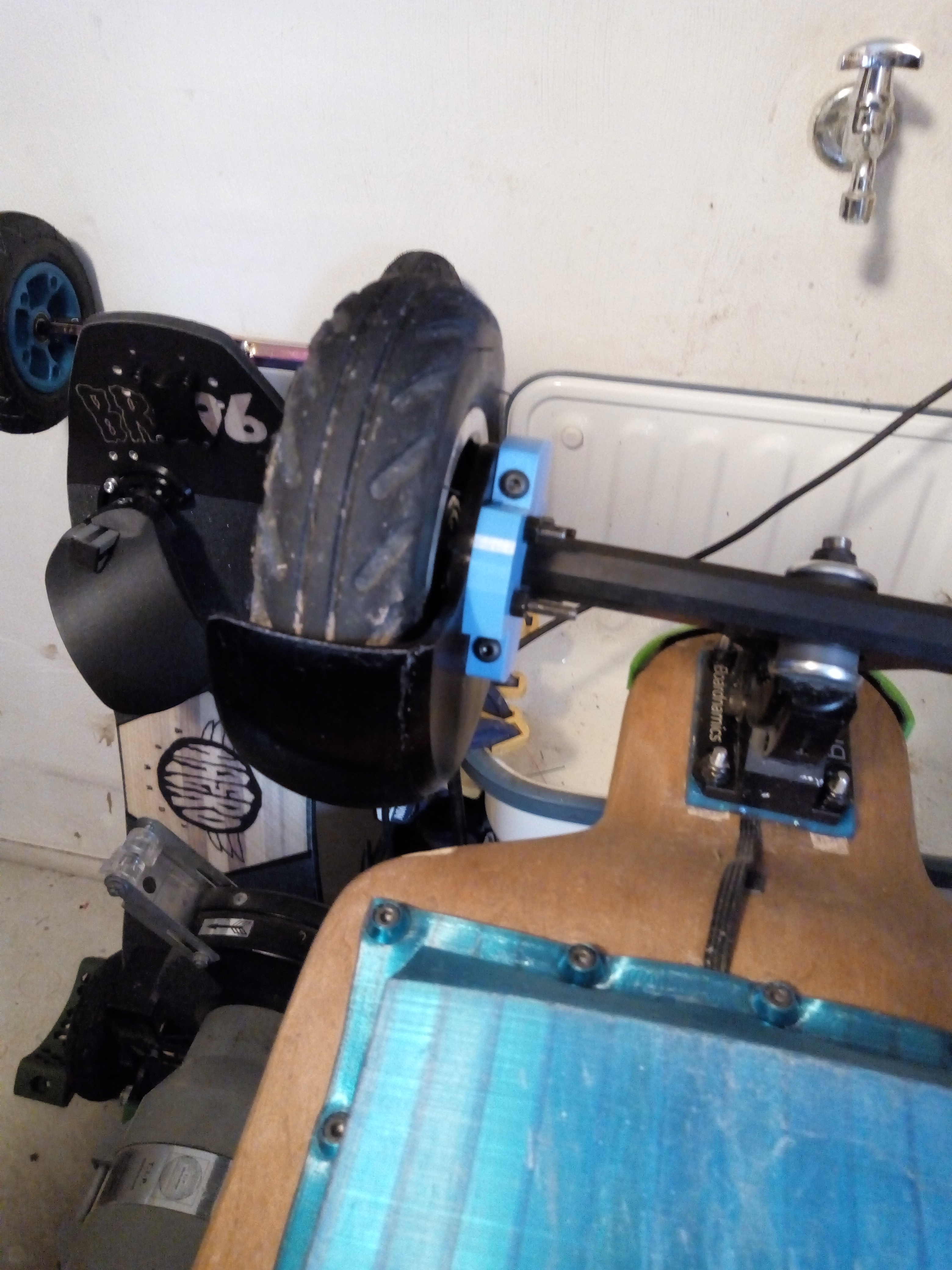 I had this same thought, so like that you went this direction to see how it works out. I was afraid that avoiding wheel bite, due to being mounted to the board, would result in too much gap for my taste between the wheel and the splash guard.