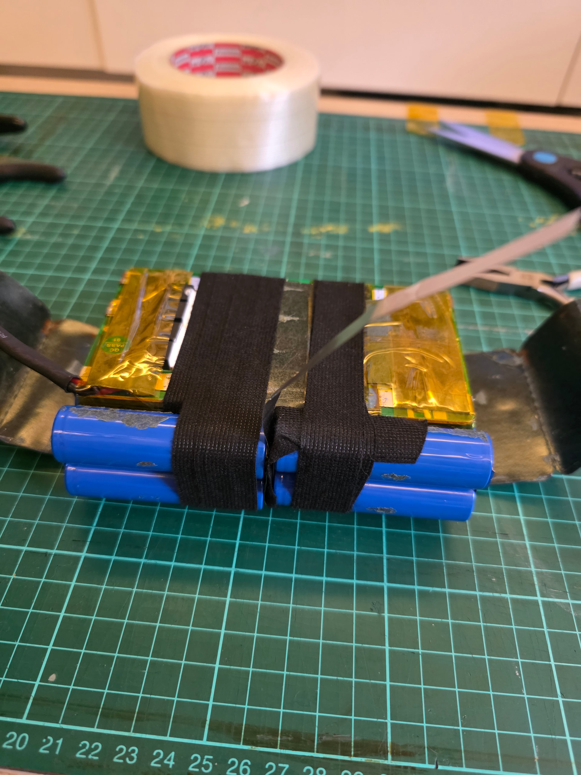 I arranged the cells and welded a long strip to the +9/-9 group series connection before i folded it into a straight line and glued with b7000 them taped with tesa 51036 into position. Gave it 20 minutes to start to set. Folded the nickel with some Flat jaw pliers and welded it to the bms pcb.