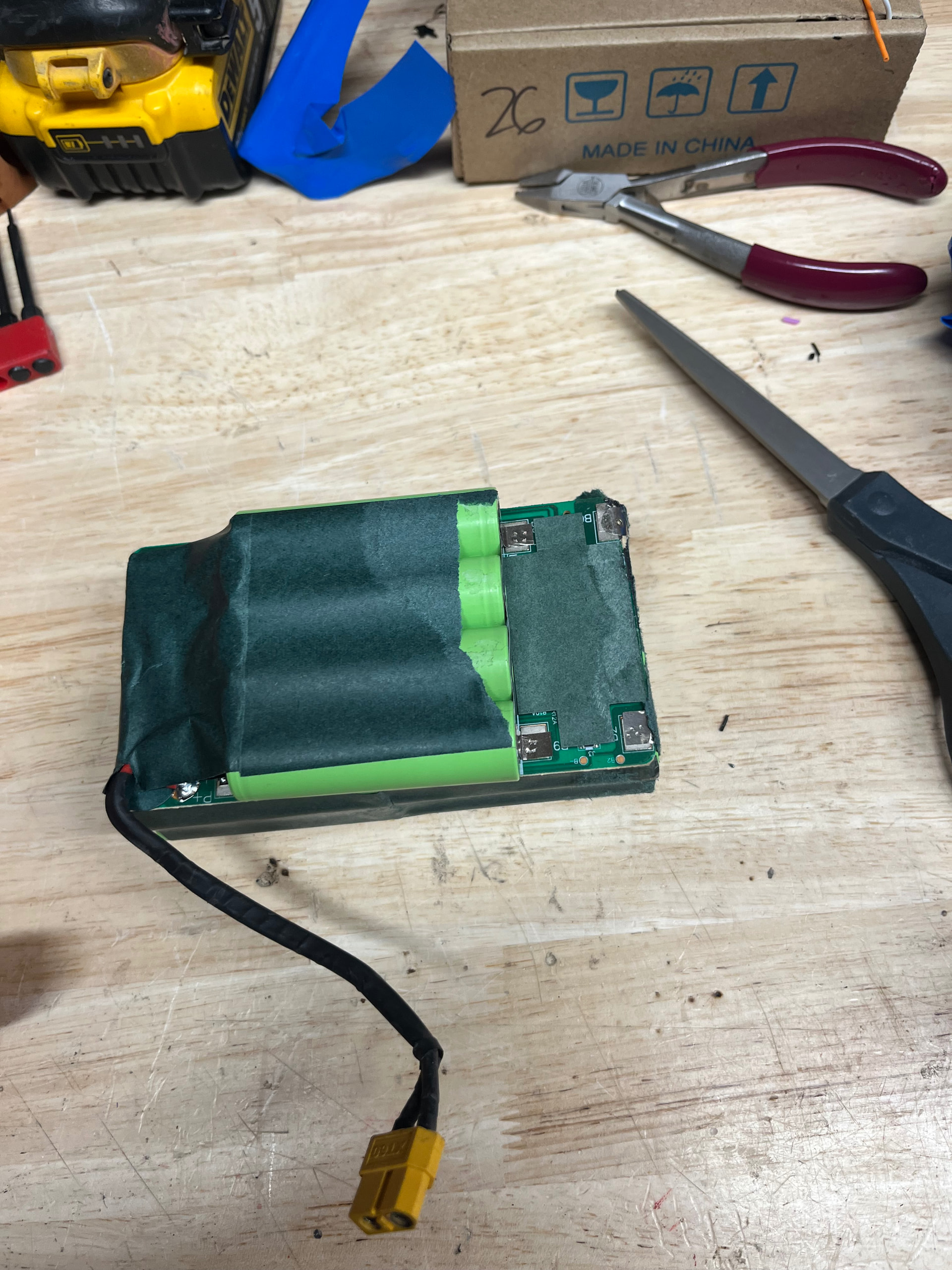 My other premade pack teardown was a 7s1P which used 2000mah ‘BFN’ brand cells rated at only 10 amps CDR to 60C , and the build quality is what destroyed that battery. They missed when spot welding steel strips to the BMS circuit board. I made 2 3s1P packs with those cells and they work OK, but I have to manually balance them fairly regularly, as one cell hits 2.5 when the other are still ~3.16v, and when i discharge them this low then they are also more than 30MV apart in the 4.15v range, and this delta just grows every cycle to where the bms cuts charging current when some 2 cells are 3.85 and one is 4.24.